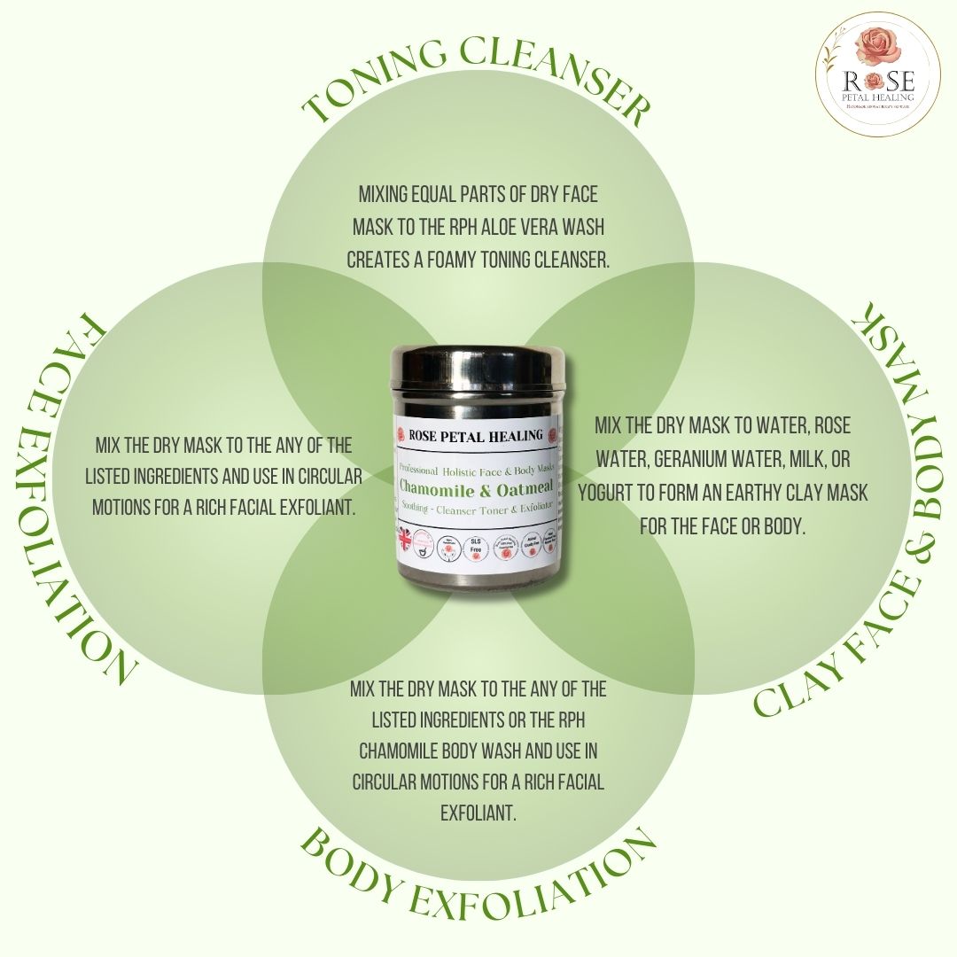 Body:Combine the clay blend with our Chamomile Wash or Rose quartz Infusions Shower gel and a bit of water to form a gritty paste. Gently scrub your face and body in circular motions, then rinse off.