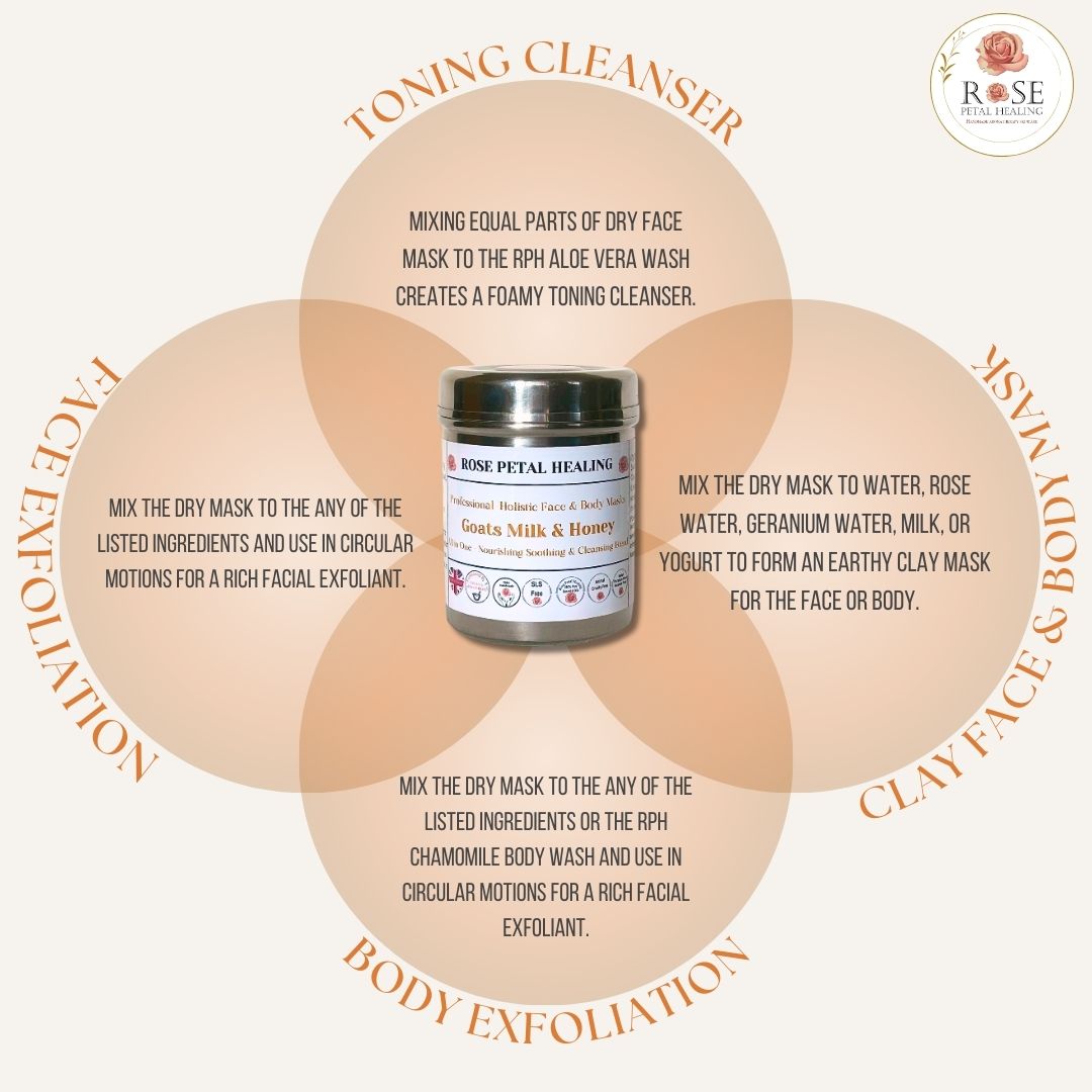 Body:Combine the clay blend with our Chamomile Wash or Rose quartz Infusions Shower gel and a bit of water to form a gritty paste. Gently scrub your face and body in circular motions, then rinse off.